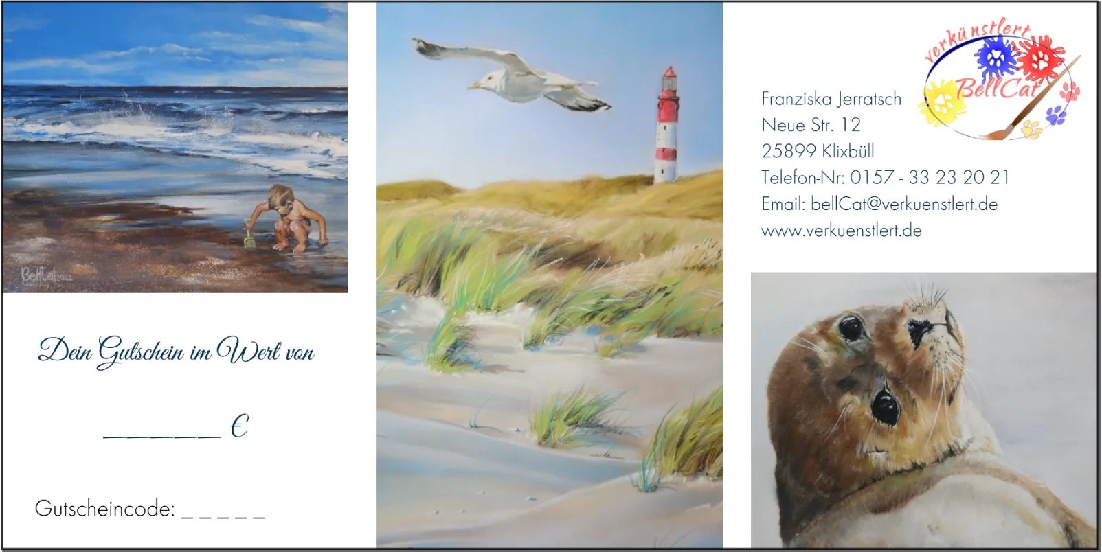 Bitte wende dich per E-mail, Kontaktformular oder Anruf an mich um die Daten auszutauschen. Wenn Du den Kunst-Gutschein mit dem gewünschten Betrag gekauft hast, bekommst Du nach Zahlungseingang von mir eine E-Mail mit einem pdf-Dokument, das Du selbst ausdrucken und direkt verschenken kannst. Alternativ schicke ich gerne per Post einen ansprechenden Geschenkgutschein mit Umschlag.